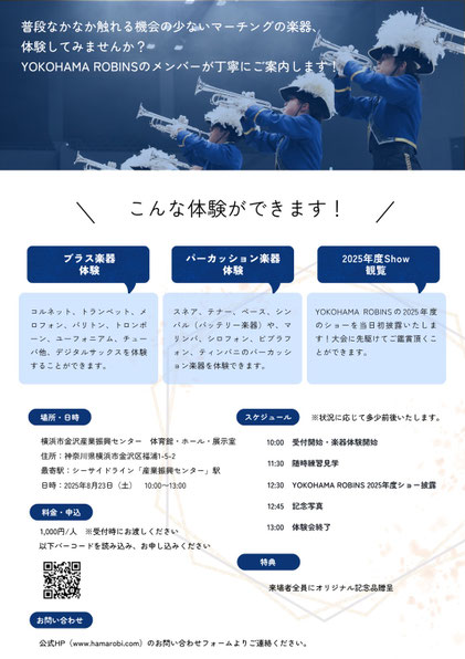 YOKOHAMA ROBINSは8/23(土)にマーチング楽器体験会を開催いたします!♥